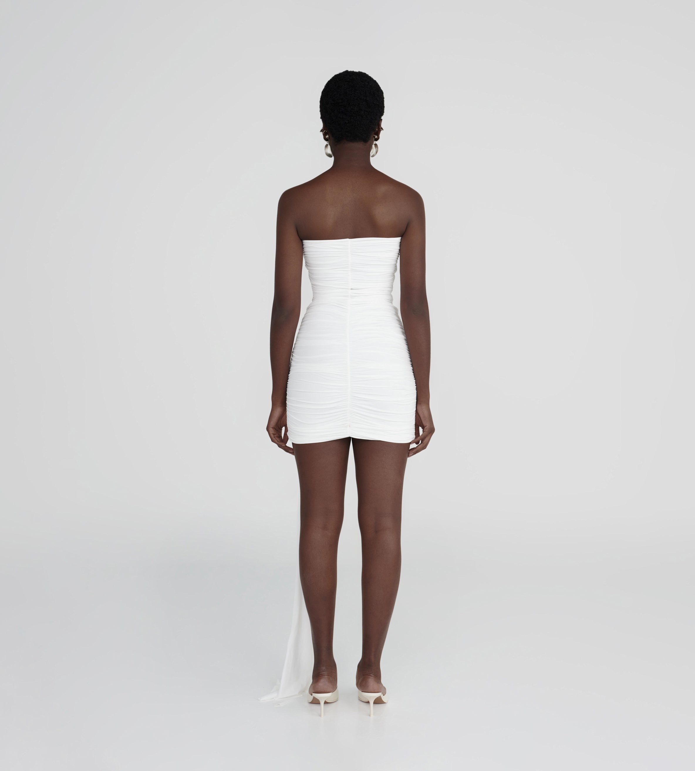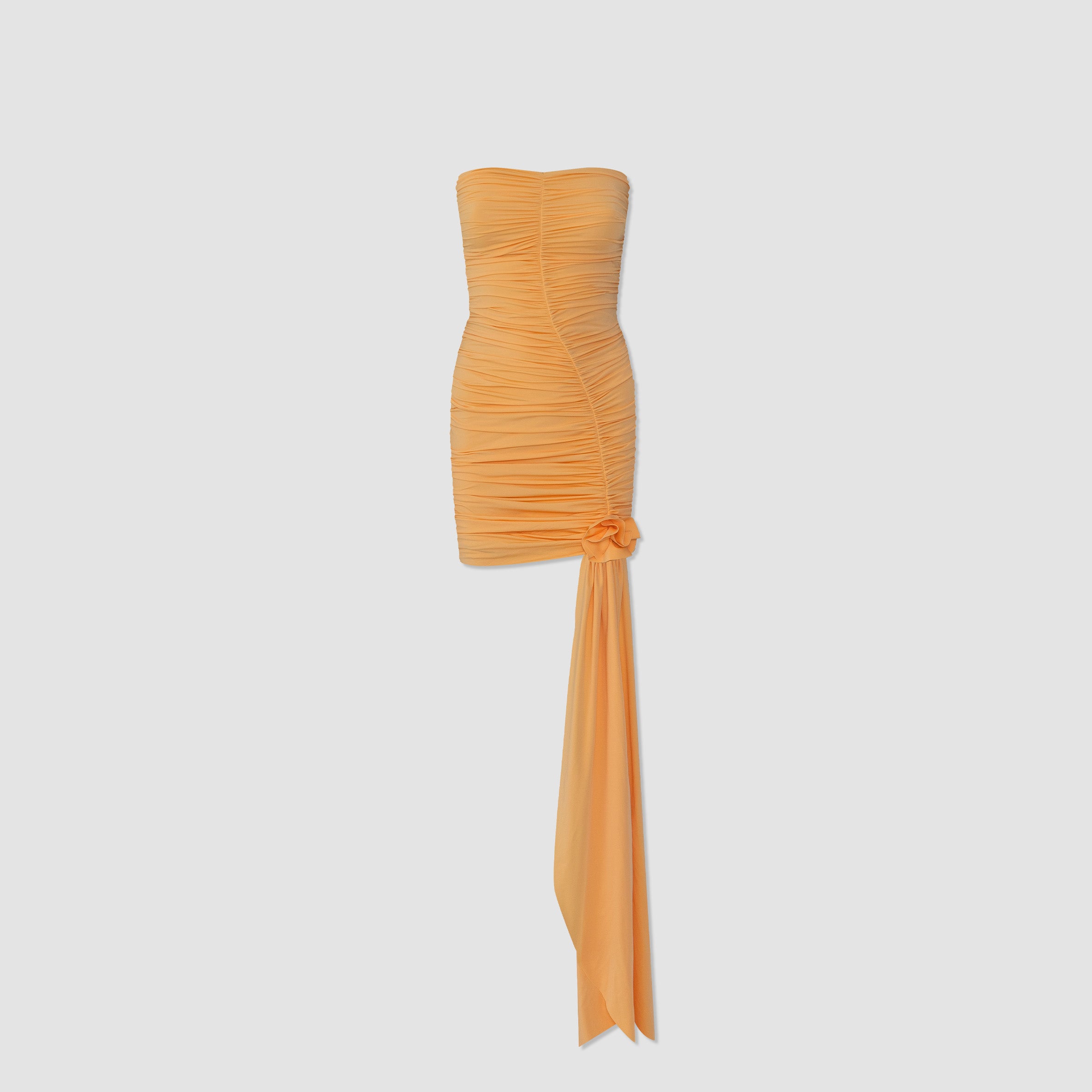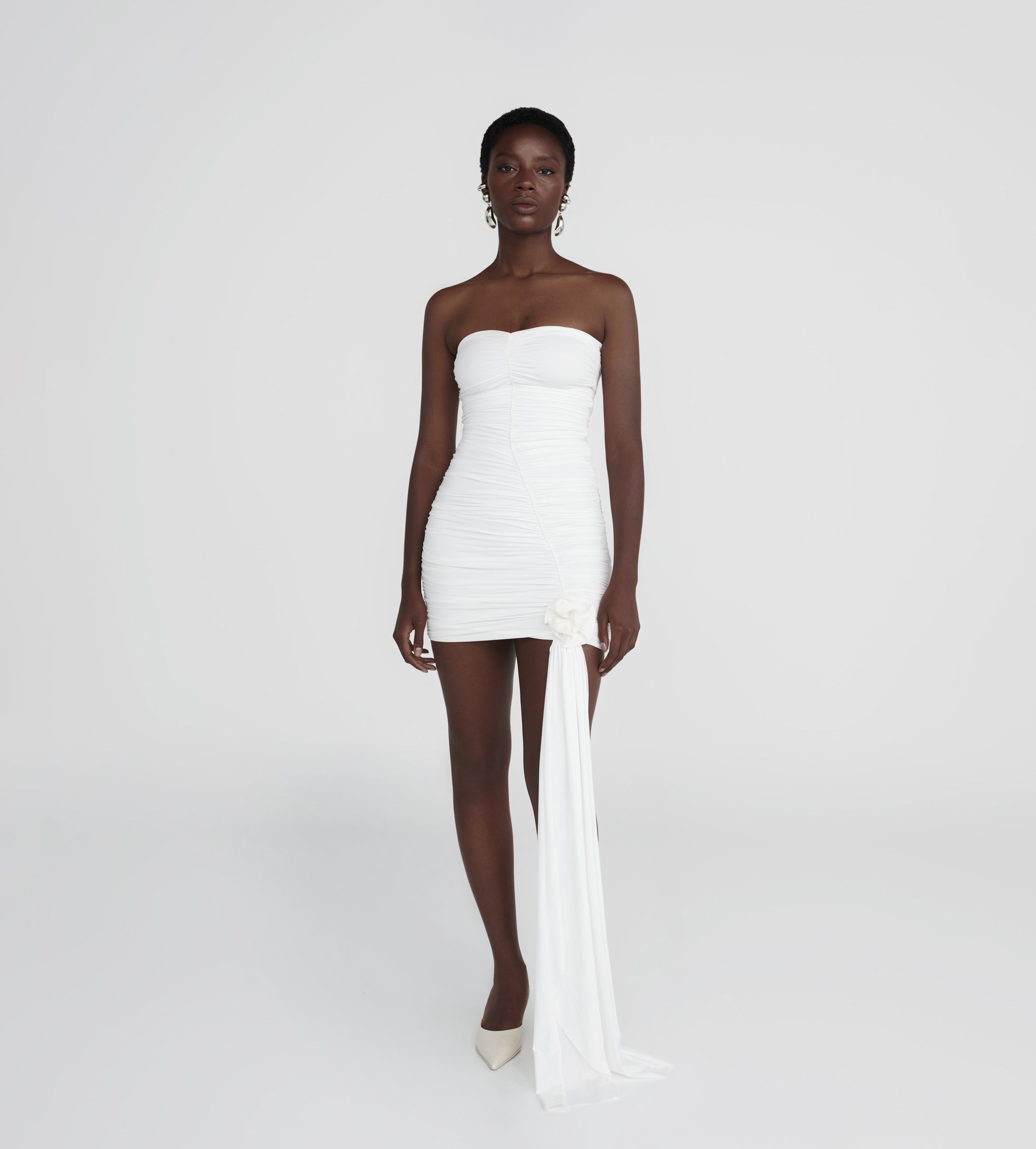Sweetheart strapless mini dress with a wave-shaped ruched design at the front and perpendicular ruching at the back; this mini dress is a must-have in your vacation suitcase. Complemented with a 3D handmade flower detail at the hem and a sensual long sash.