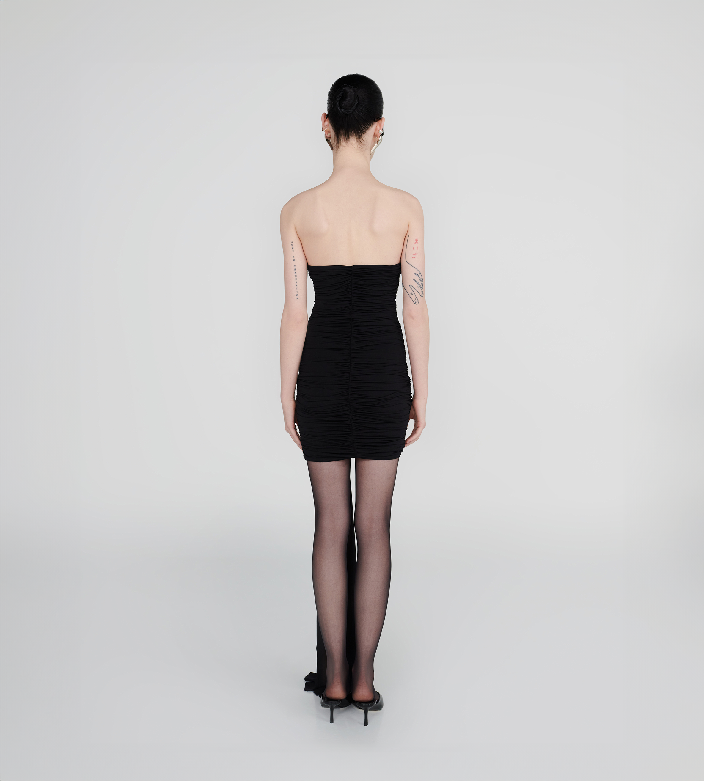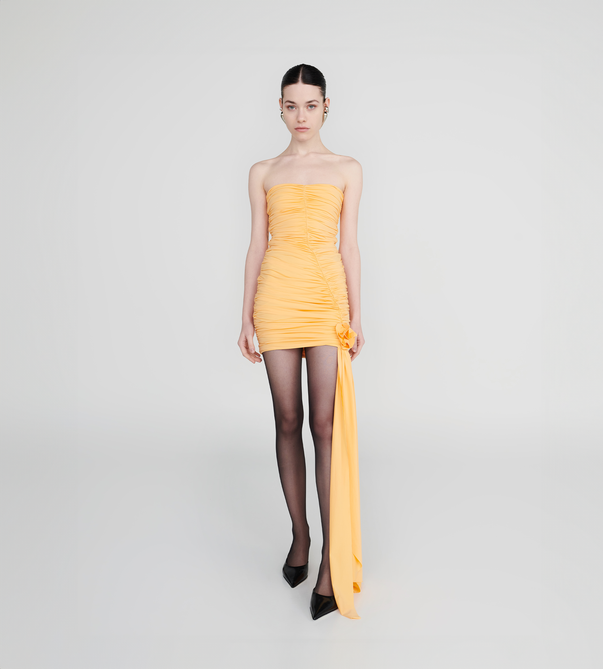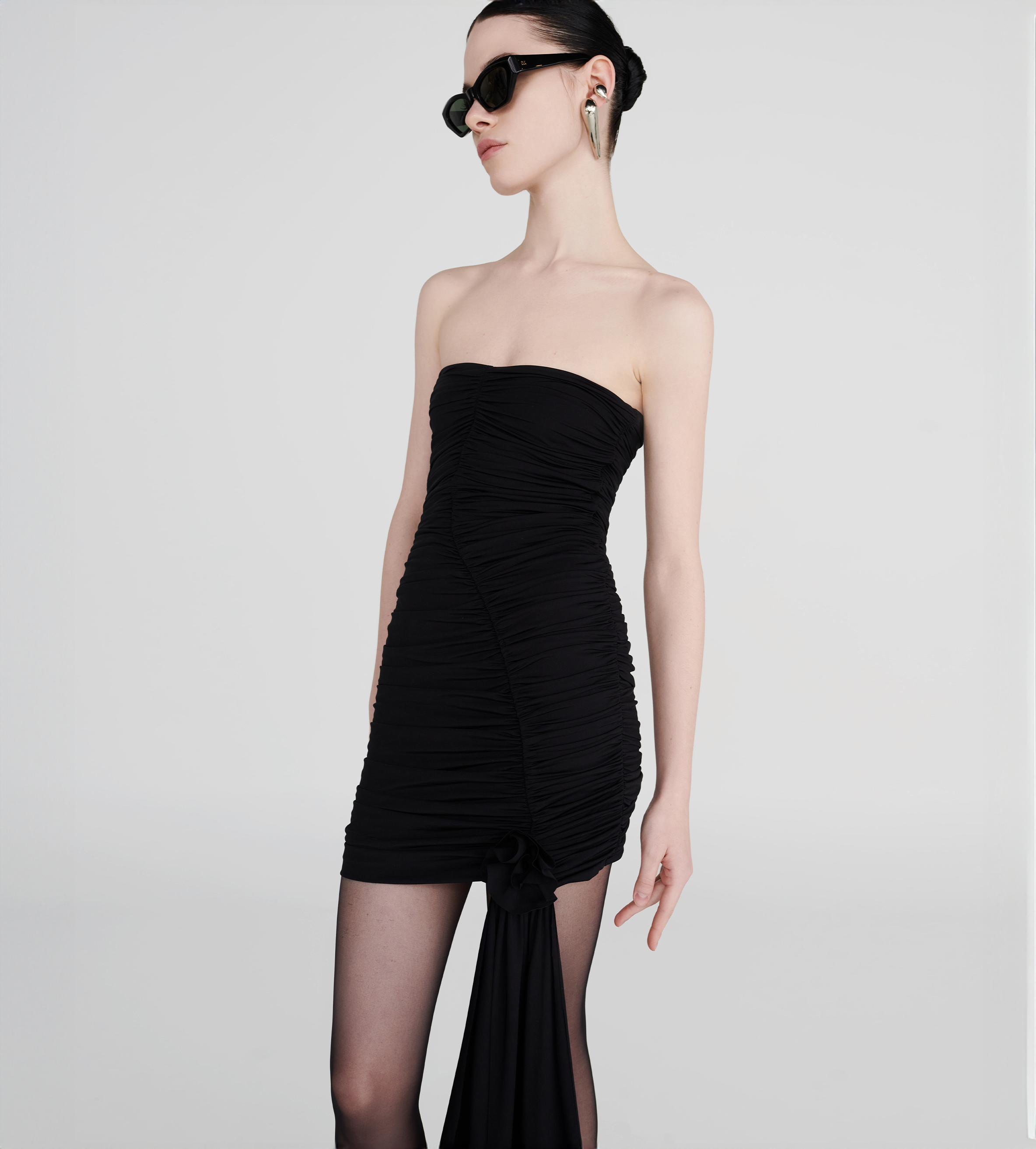 Sweetheart strapless mini dress with a wave-shaped ruched design at the front and perpendicular ruching at the back; this mini dress is a must-have in your vacation suitcase. Complemented with a 3D handmade flower detail at the hem and a sensual long sash.