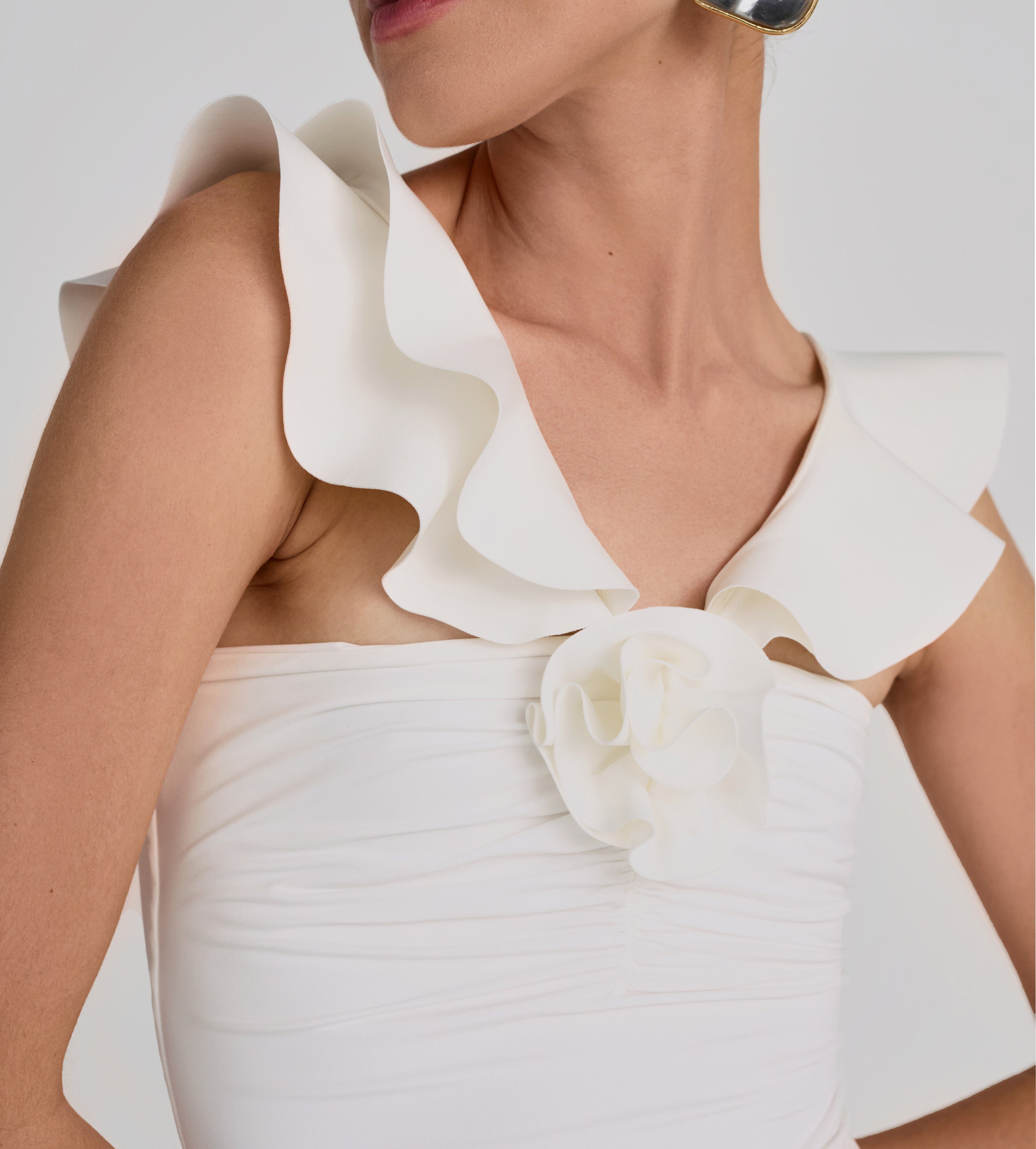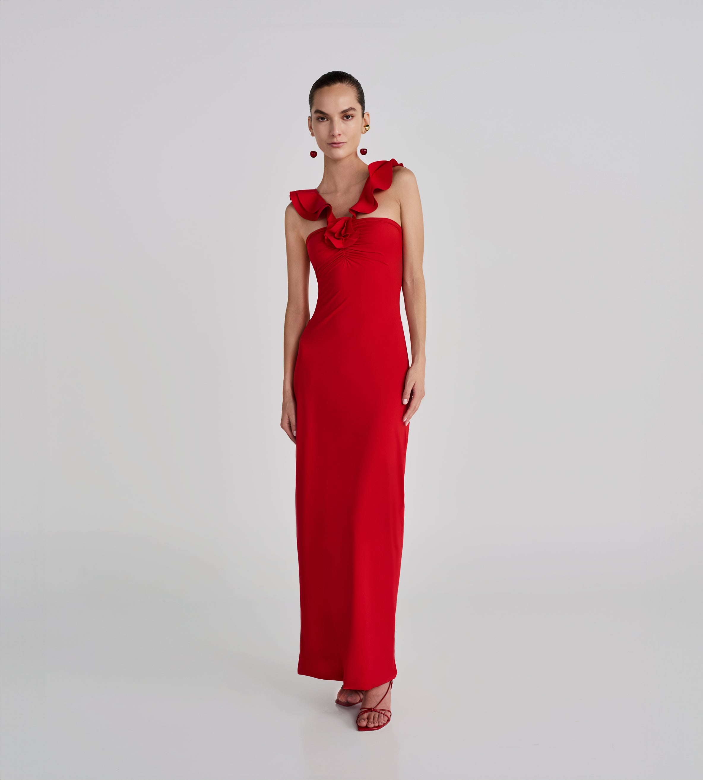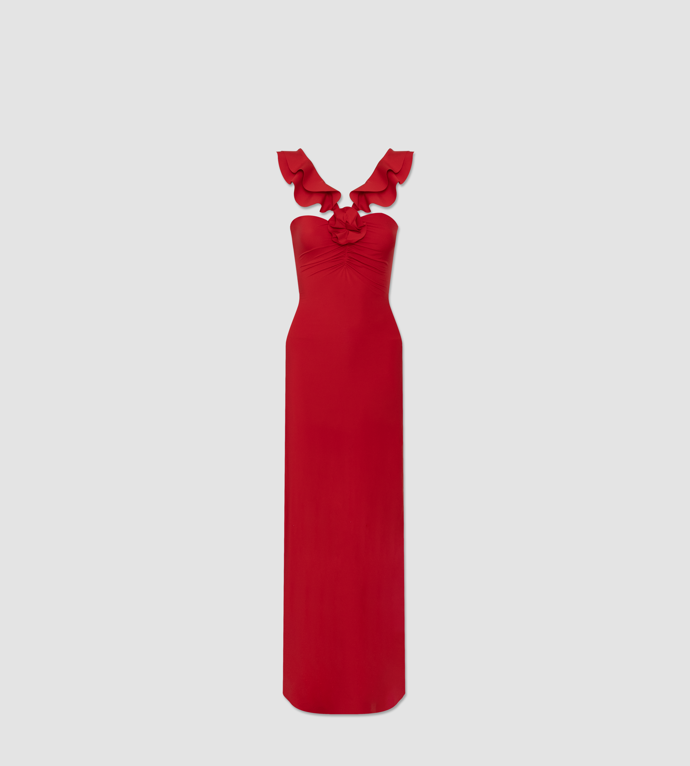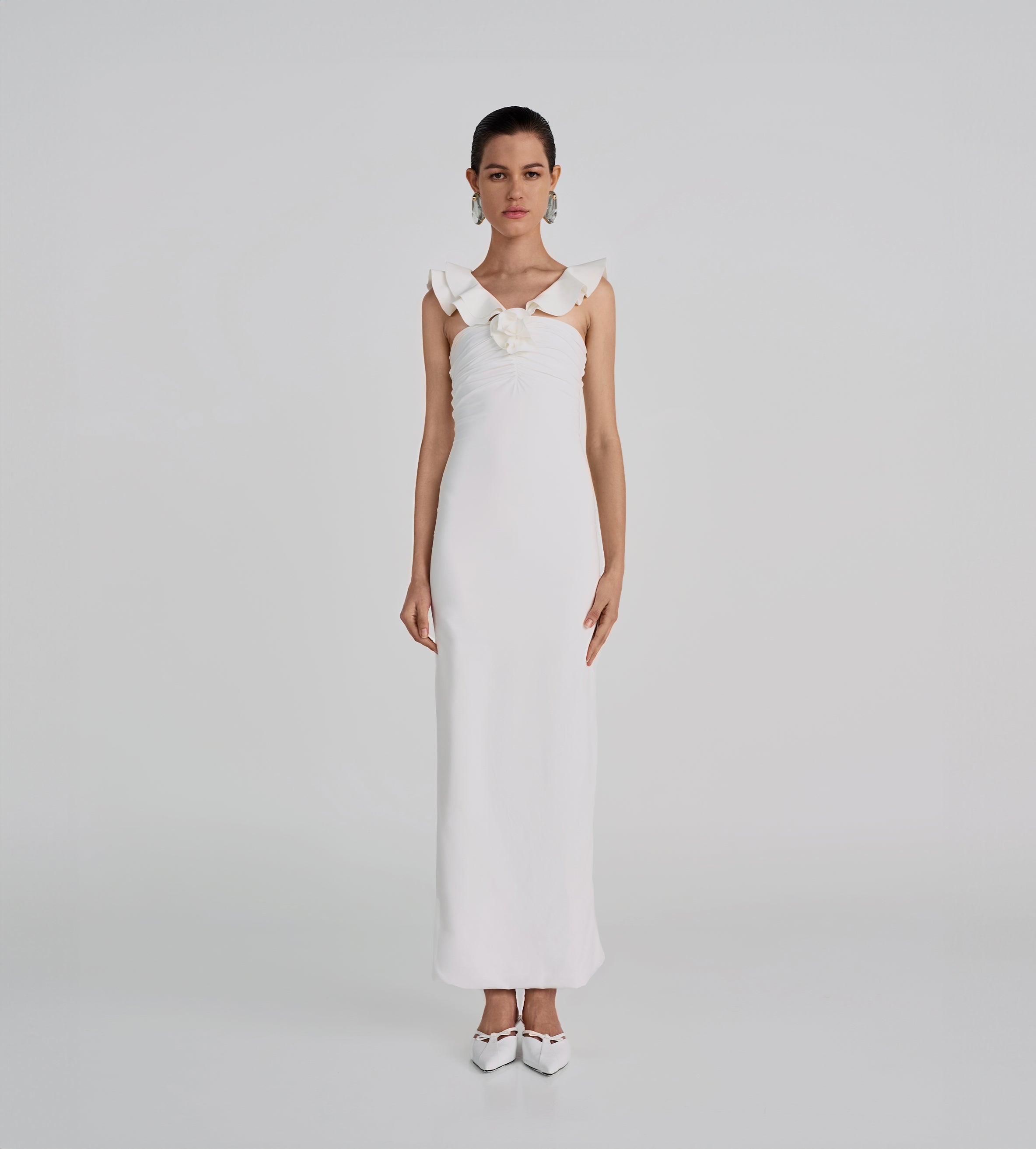 Semi-sweetheart neckline long fitted dress, with double-layered ruffle multifunctional straps, offering versatile styling options. Finished with a ruched detail at the front and a 3D handmade flower, a collection of details that embodies the essence of our brand.