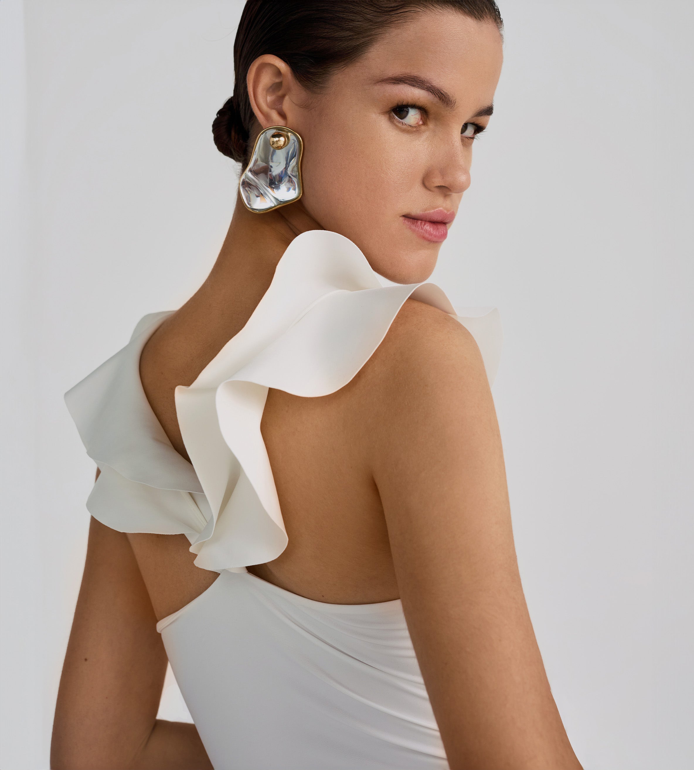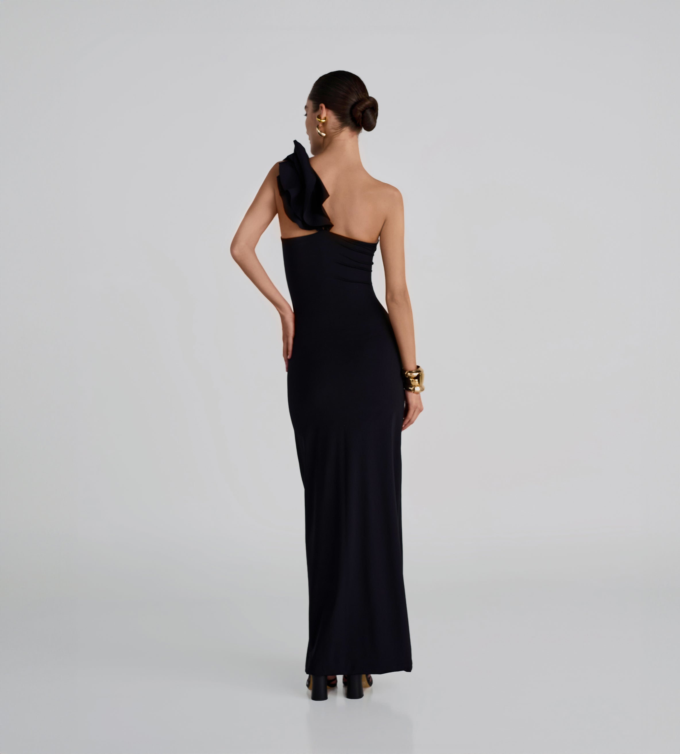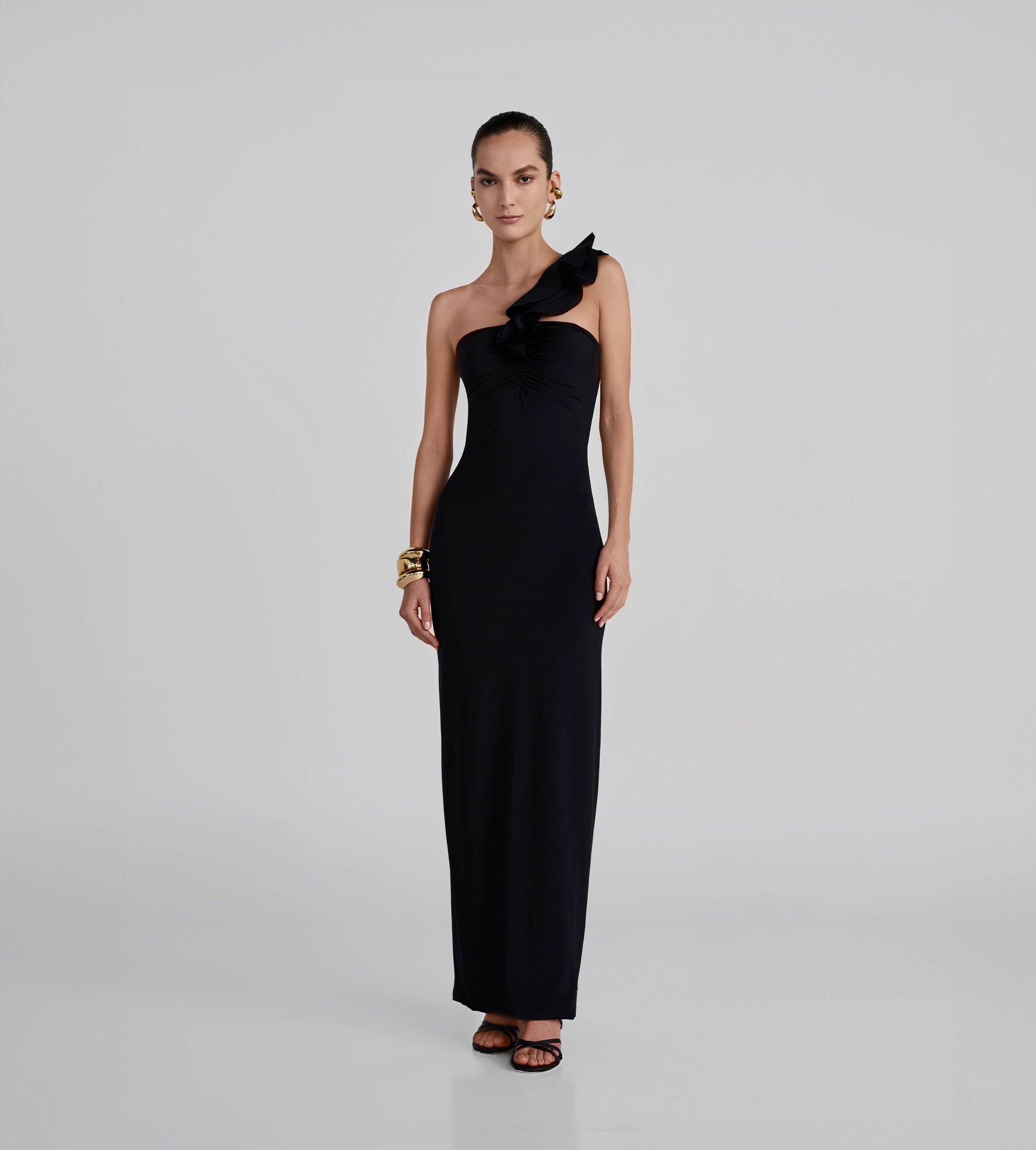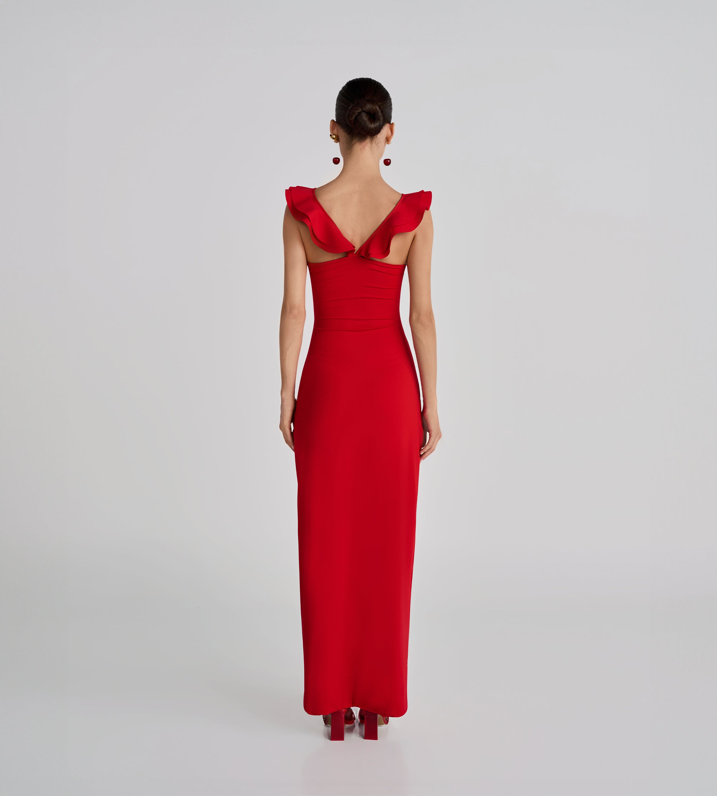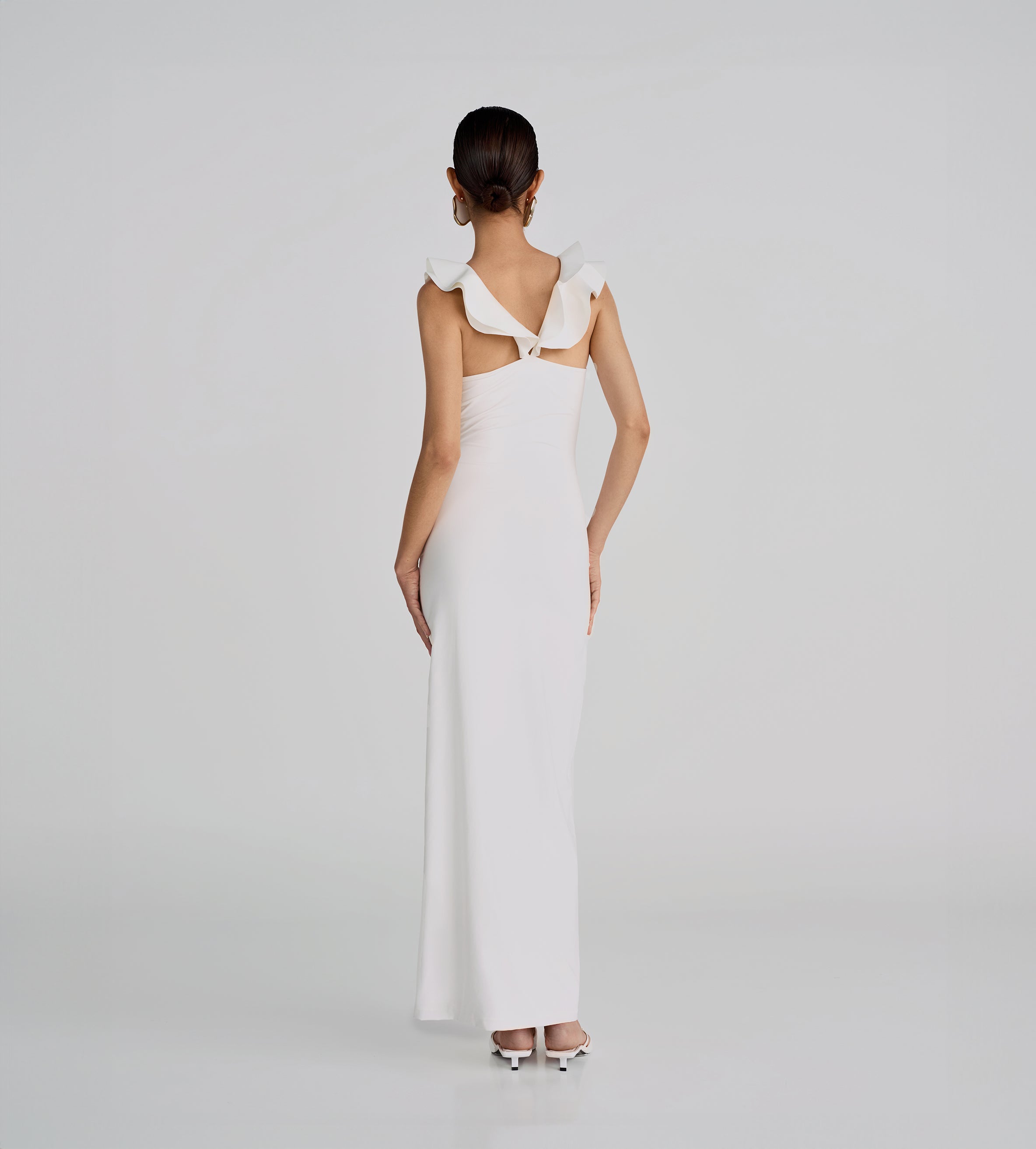 Semi-sweetheart neckline long fitted dress, with double-layered ruffle multifunctional straps, offering versatile styling options. Finished with a ruched detail at the front and a 3D handmade flower, a collection of details that embodies the essence of our brand.
