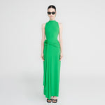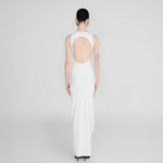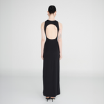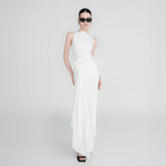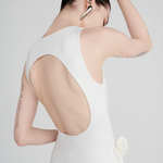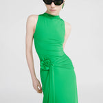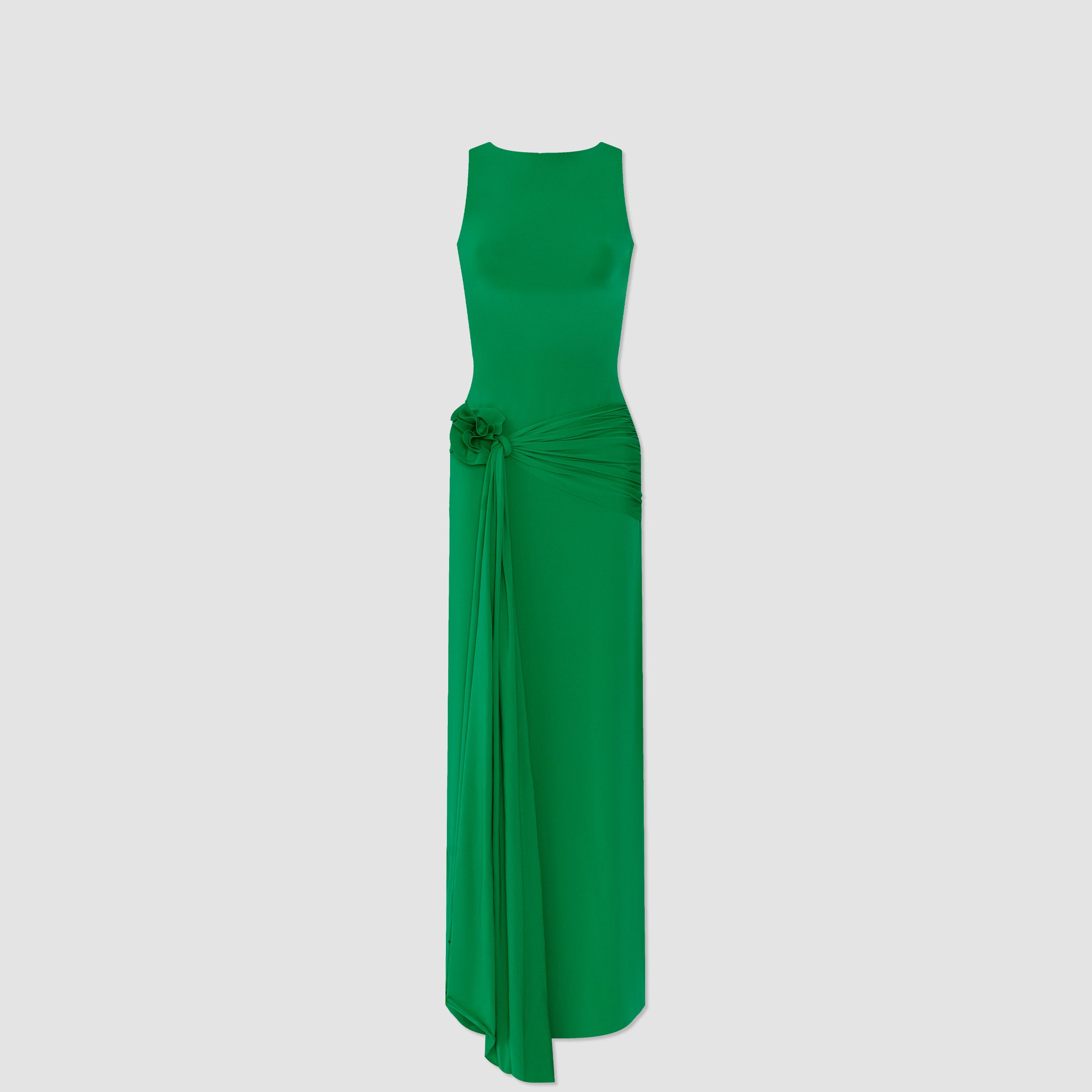 Our Tirso long dress is the ultimate fitted dress, with a round neckline at the front and a sensual open back. It hugs the body in all the right places and features a ruched adjustable sash at the waist for that extra detail. Finished with a 3D handmade flower detail, it's an alluring and powerful mix.