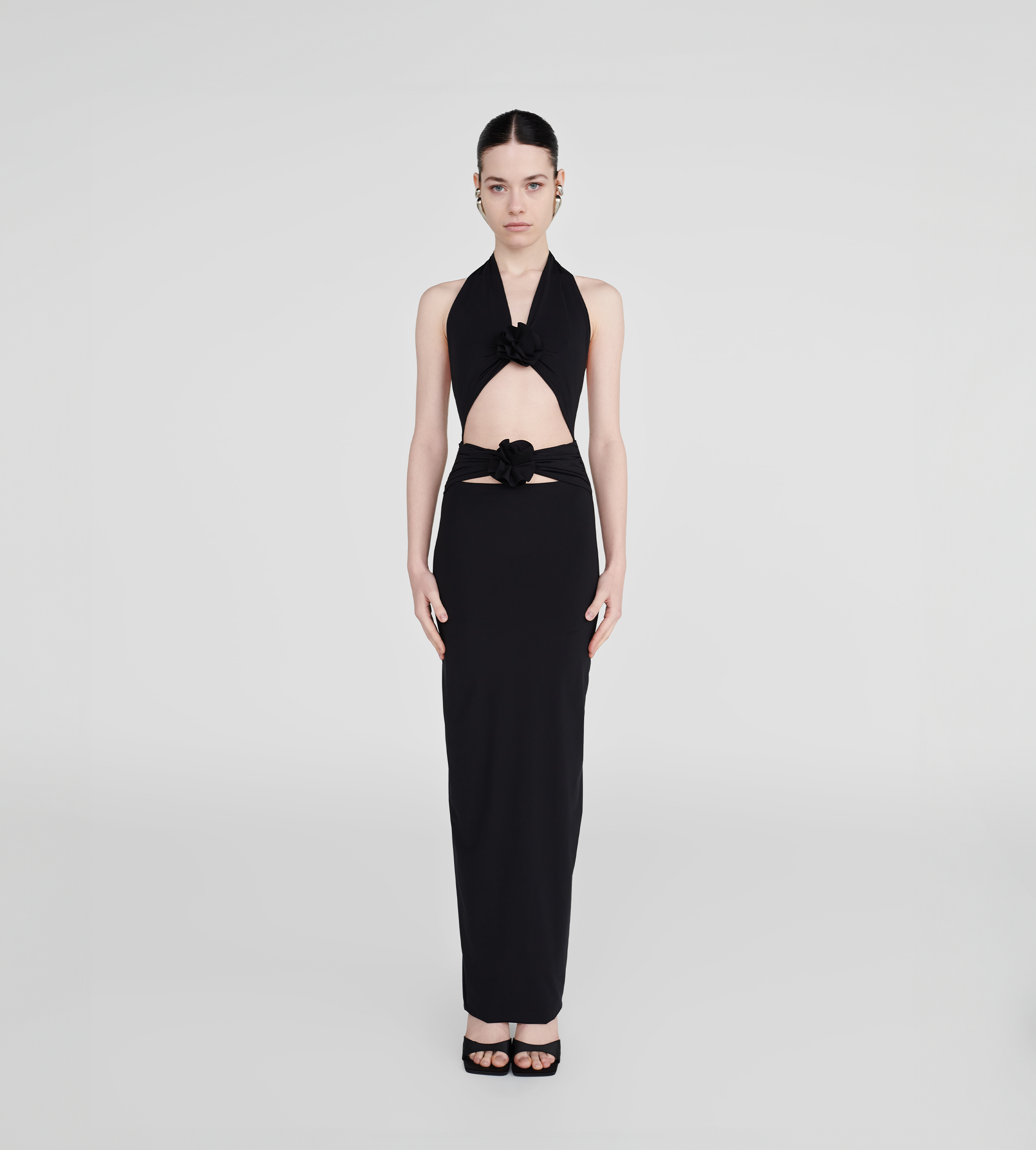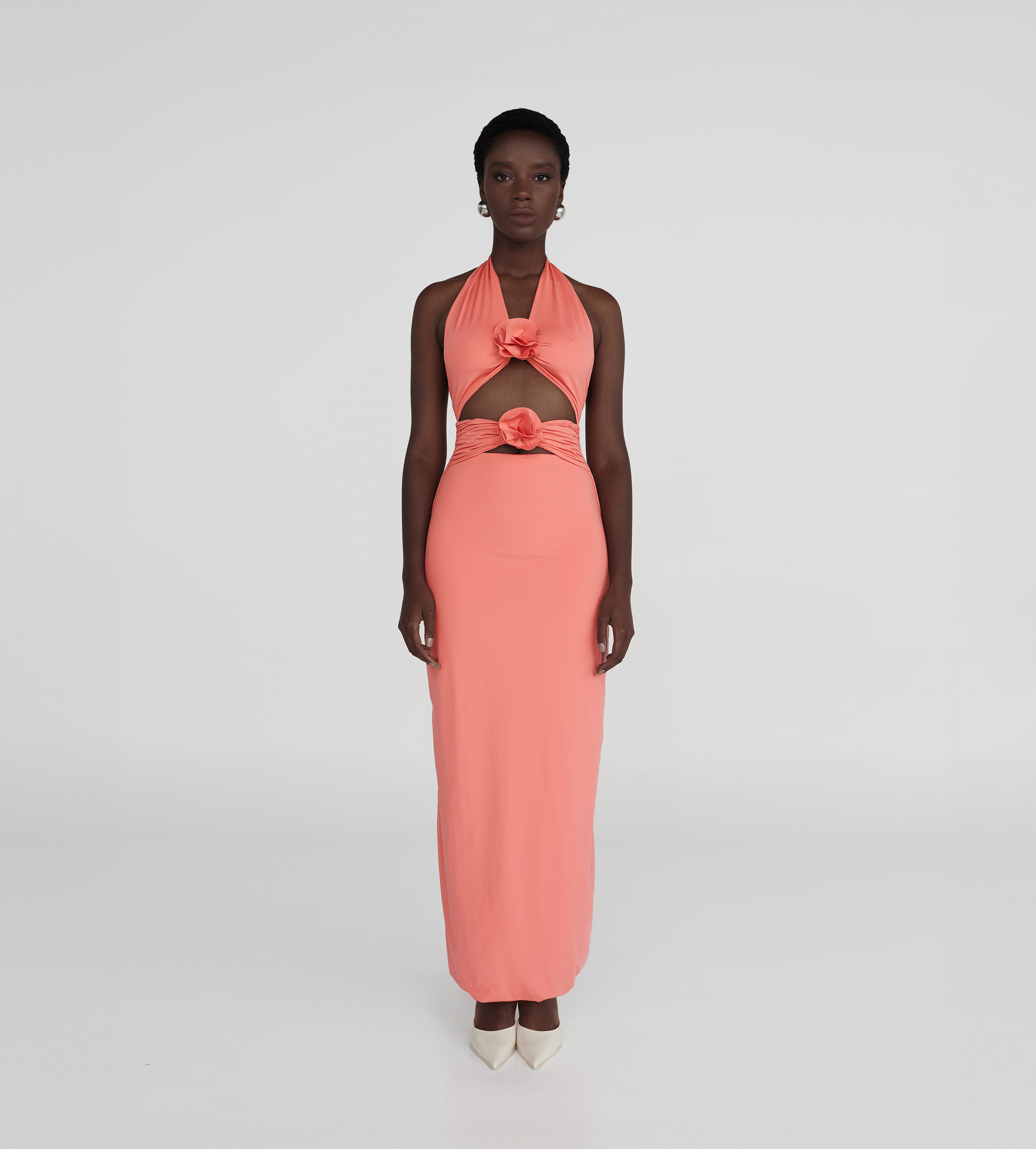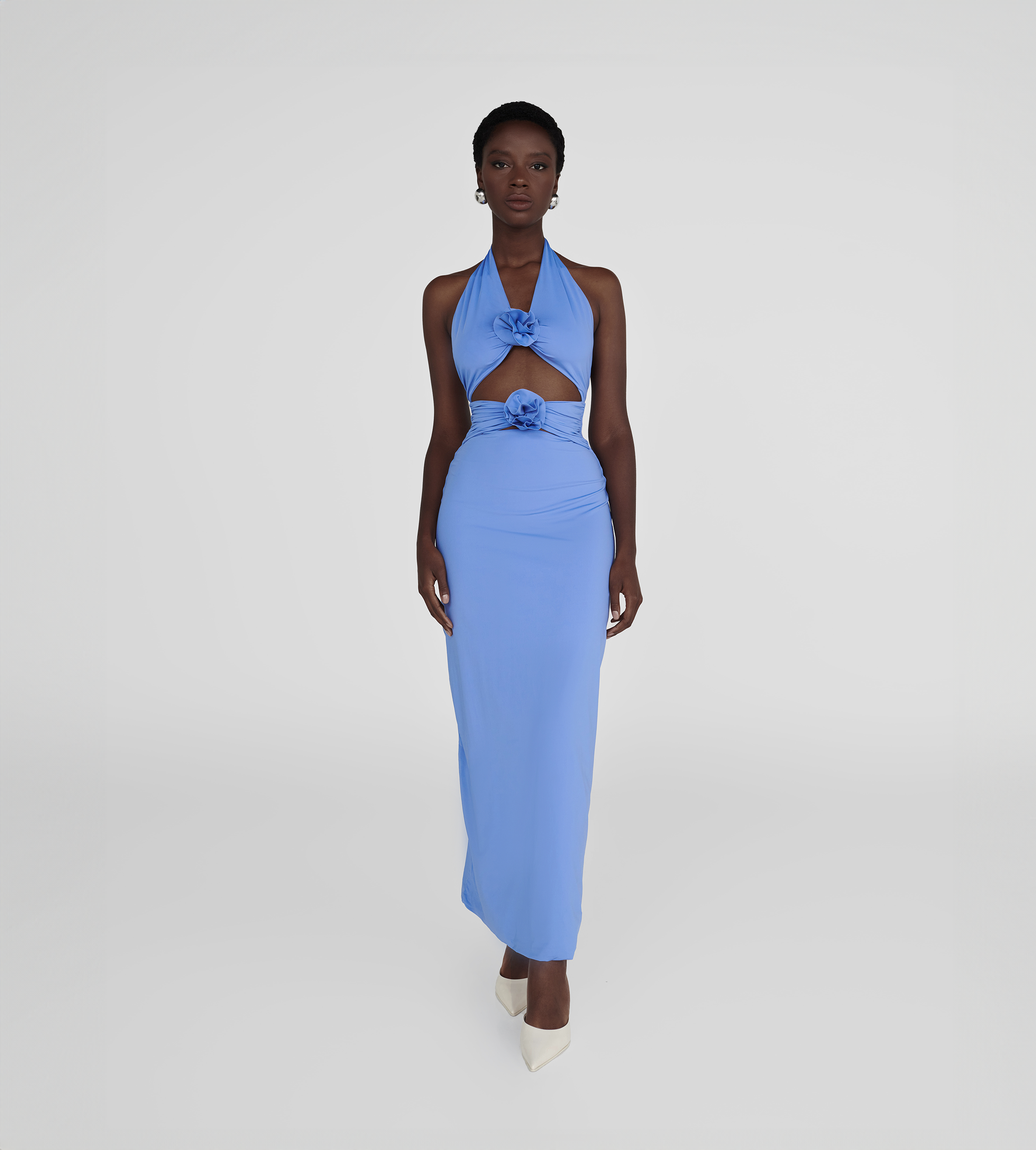 Deep halter neckline maxi dress with an alluring open back, blossoming 3D handmade flowers that enhance playful cutouts and complement a ruched waistband detail, rounded up with a flirty long skirt, characterizes our Vaupes dress – your perfect day-to-night party companion.