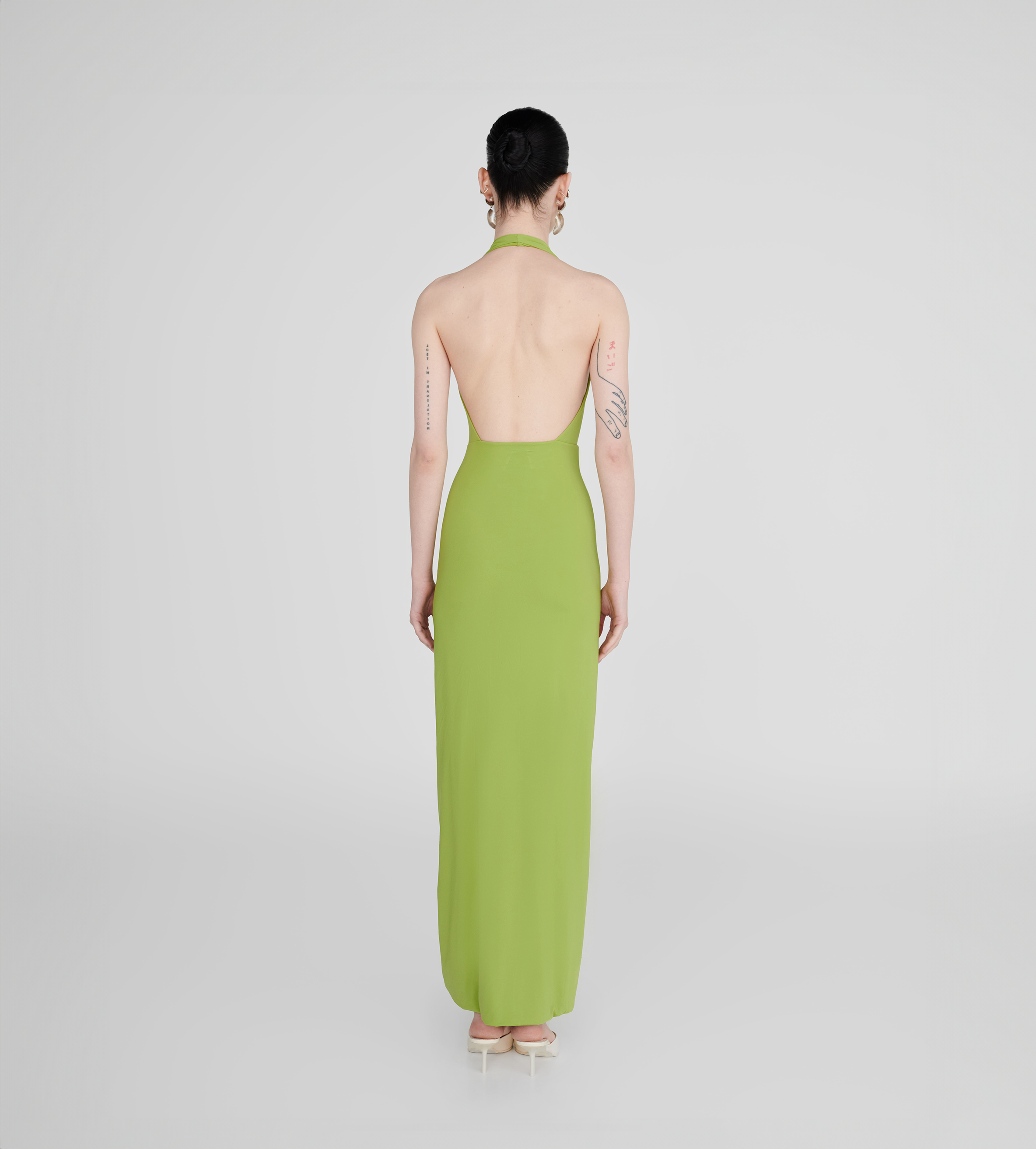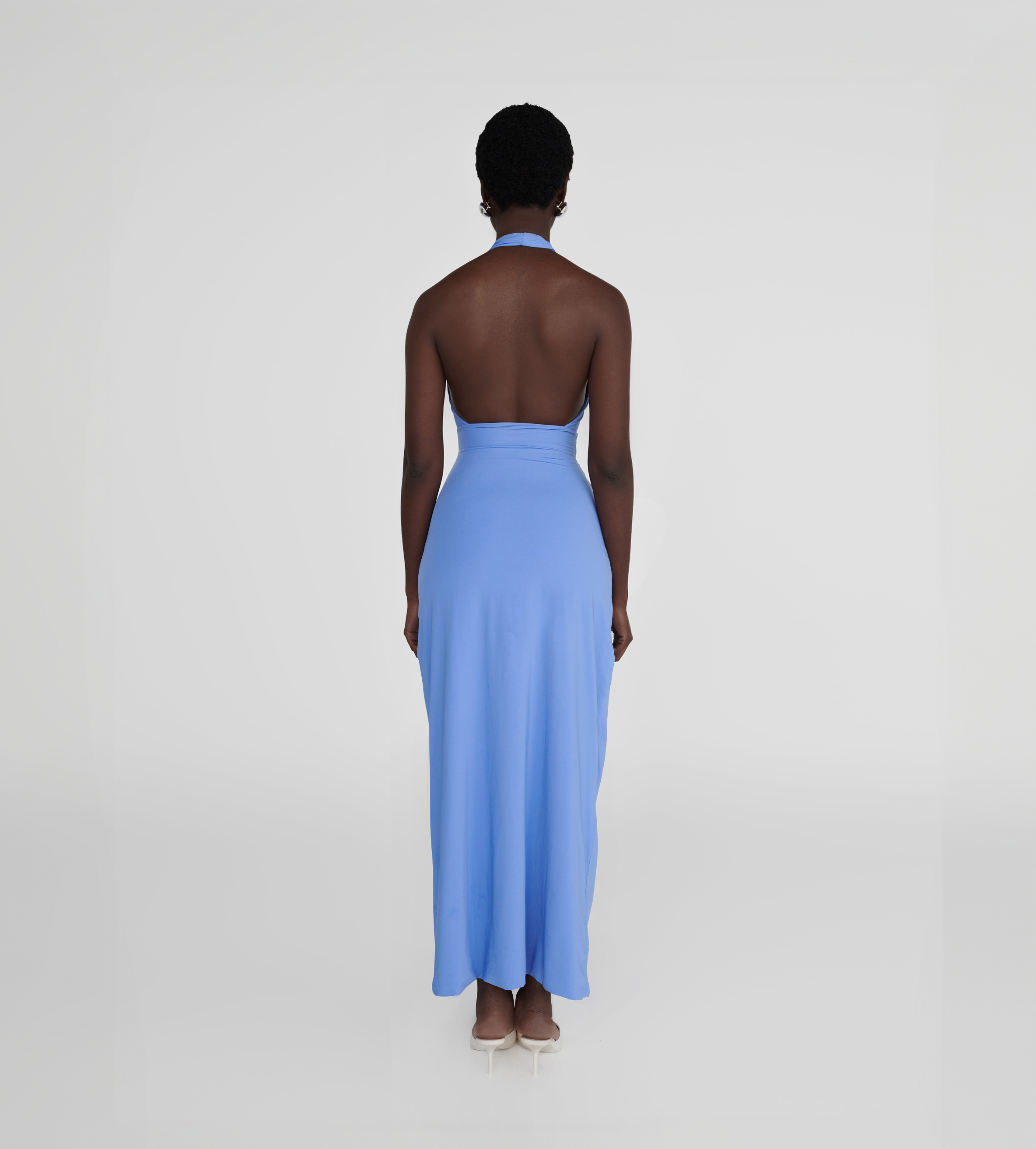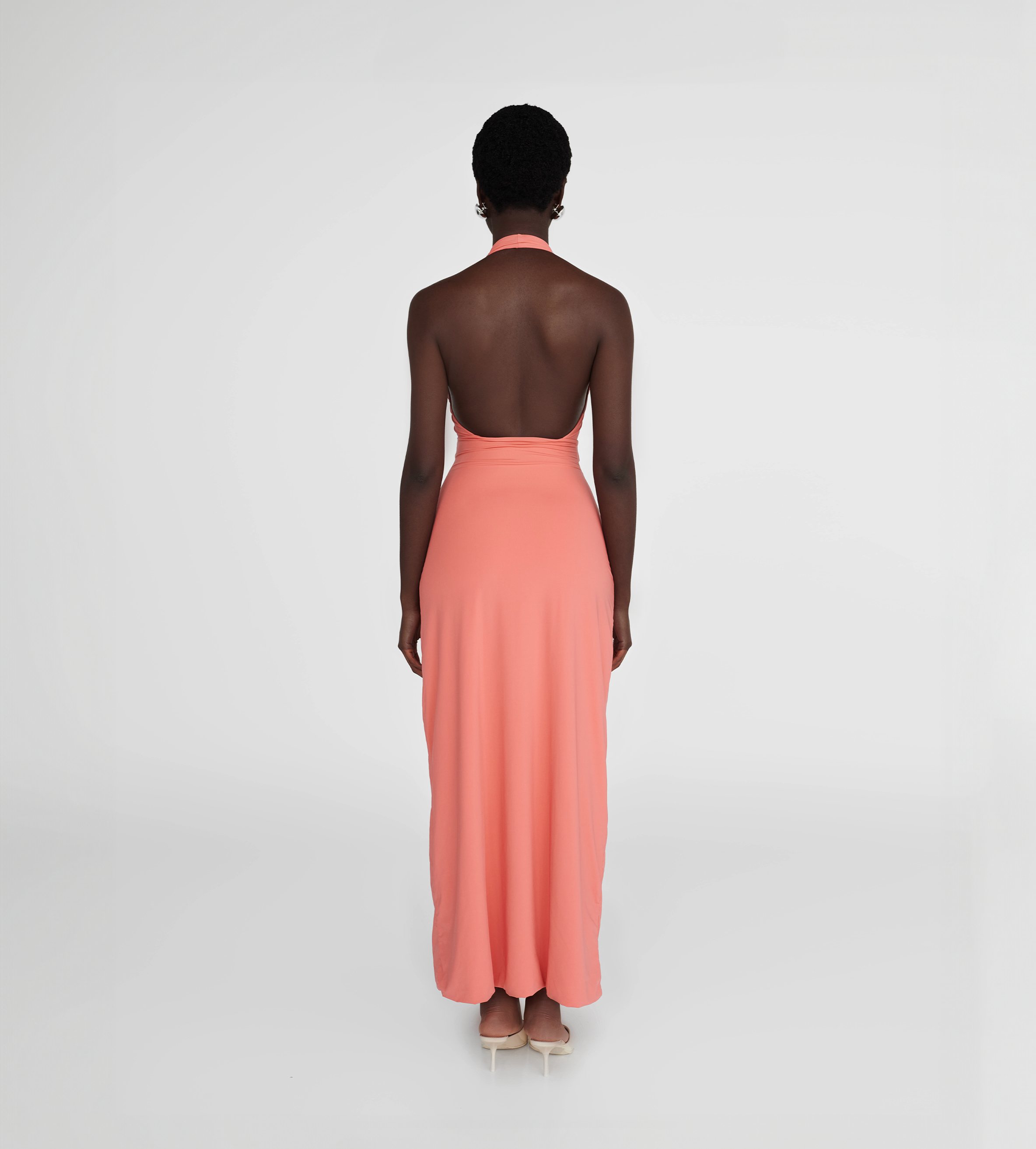 Deep halter neckline maxi dress with an alluring open back, blossoming 3D handmade flowers that enhance playful cutouts and complement a ruched waistband detail, rounded up with a flirty long skirt, characterizes our Vaupes dress – your perfect day-to-night party companion.