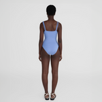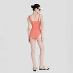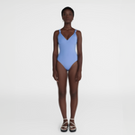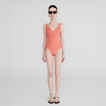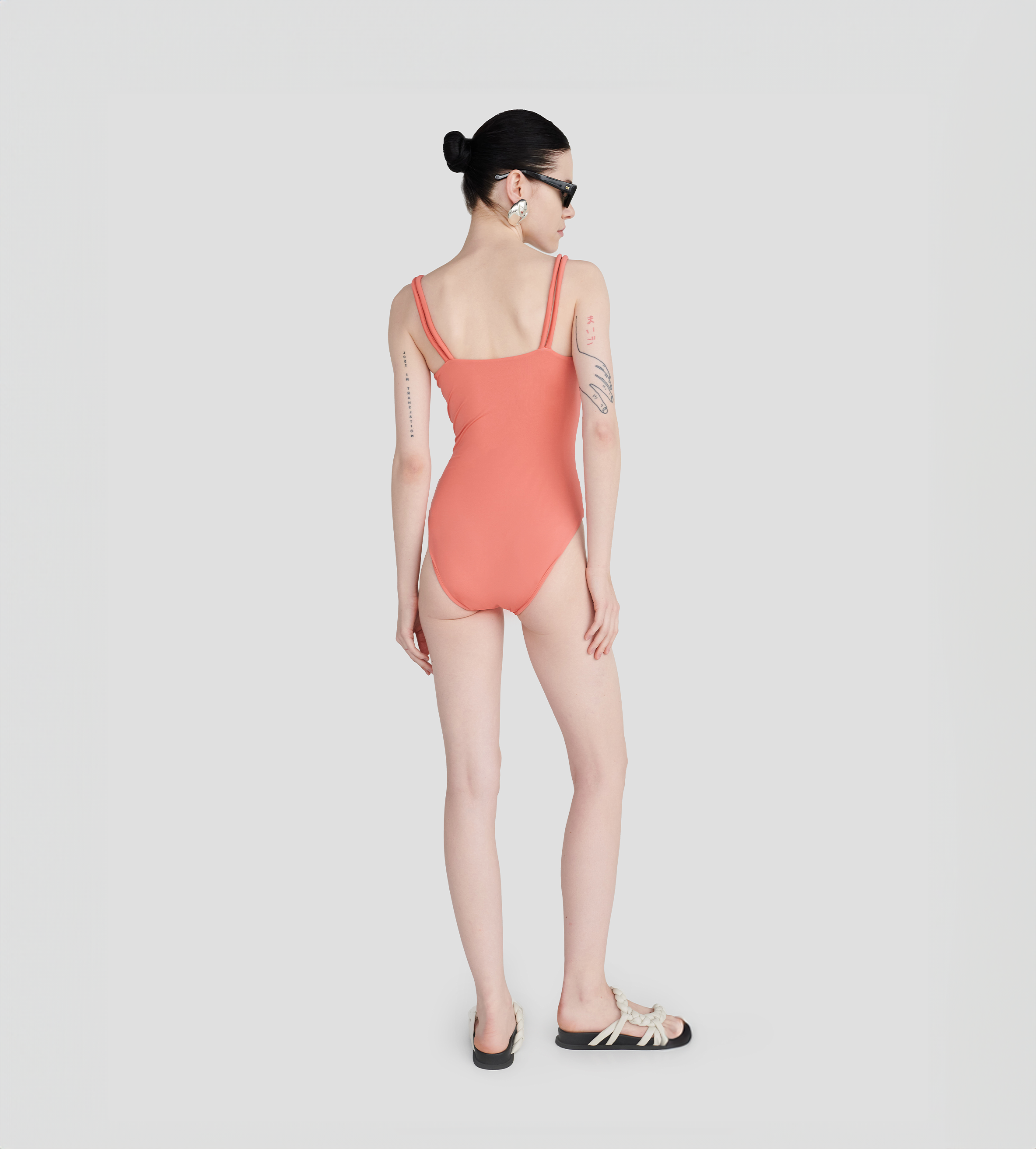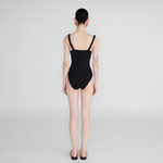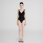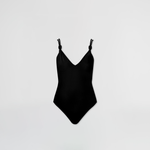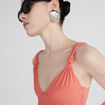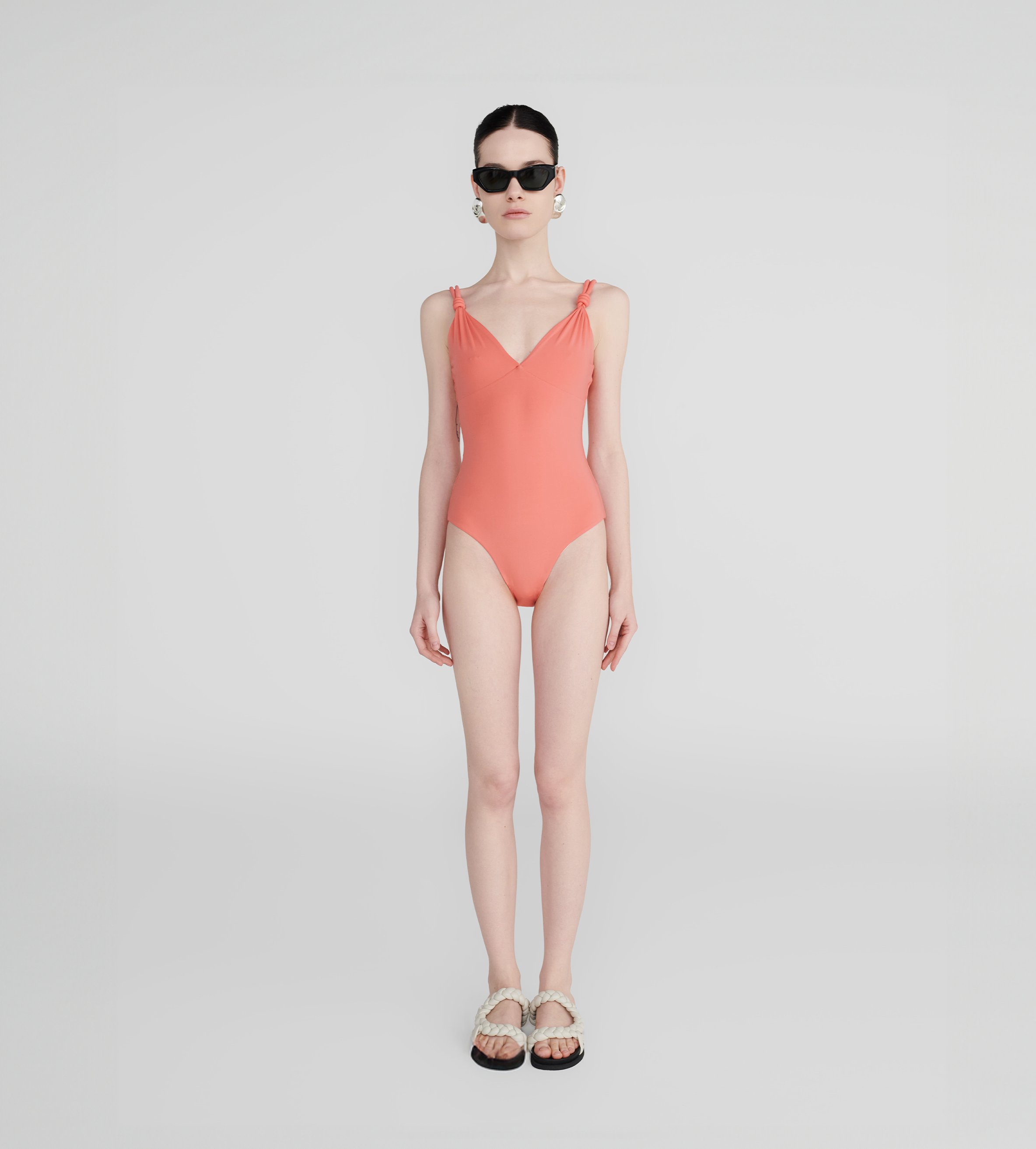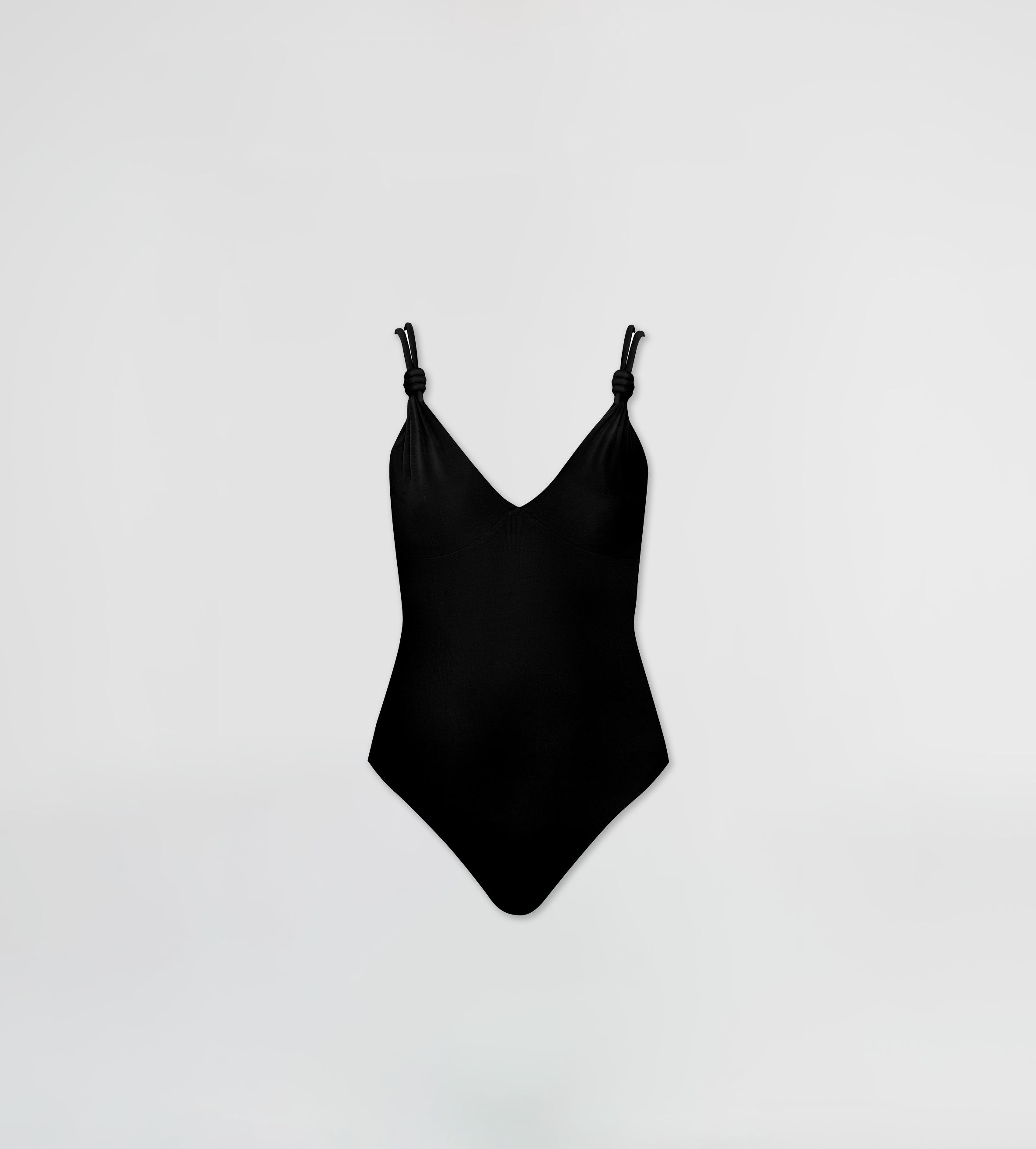 Deep V-neckline one-piece, with slim double straps that are dramatically decorated with handmade knots, representing the connections we craft and the bonds we make through life.