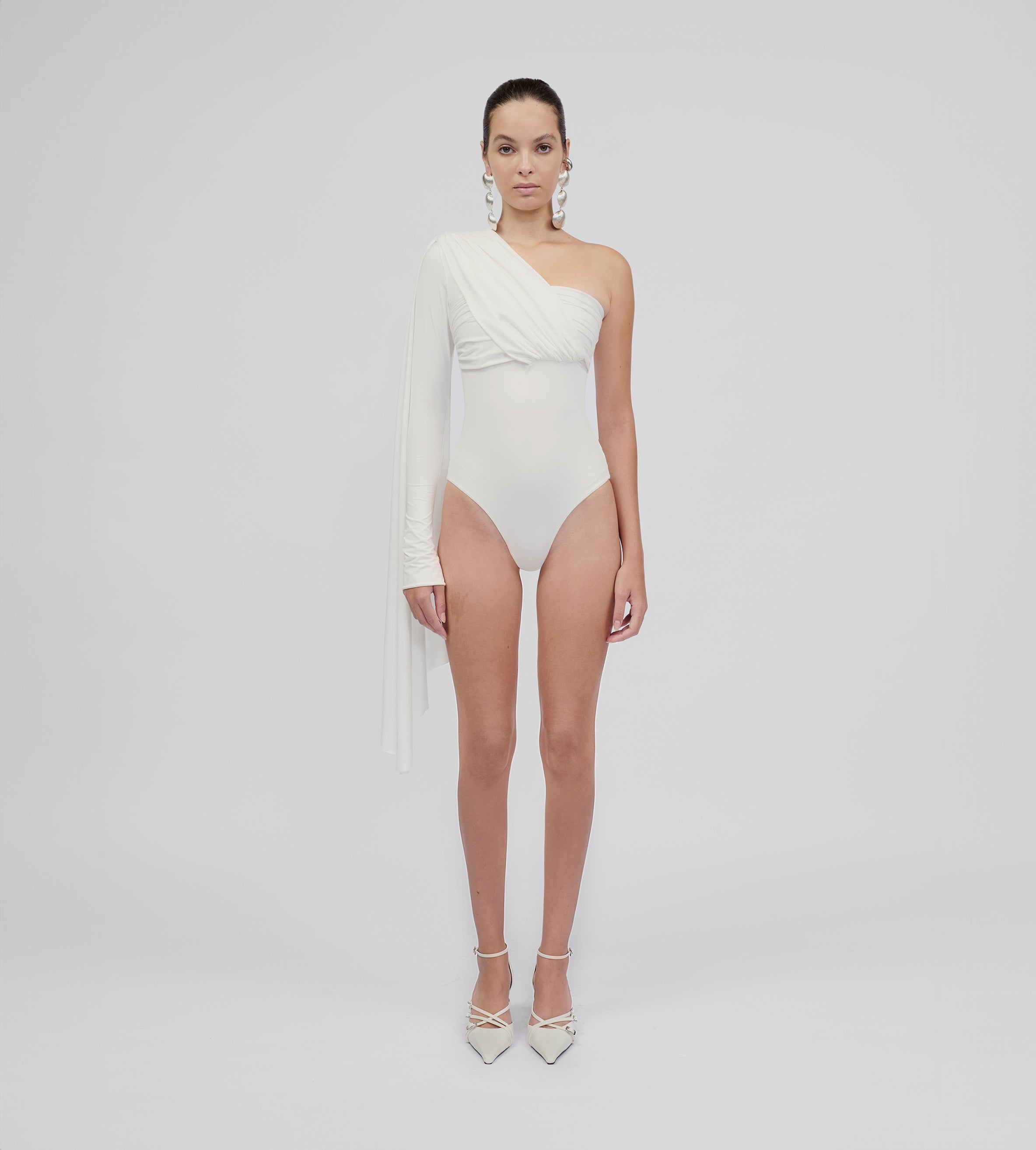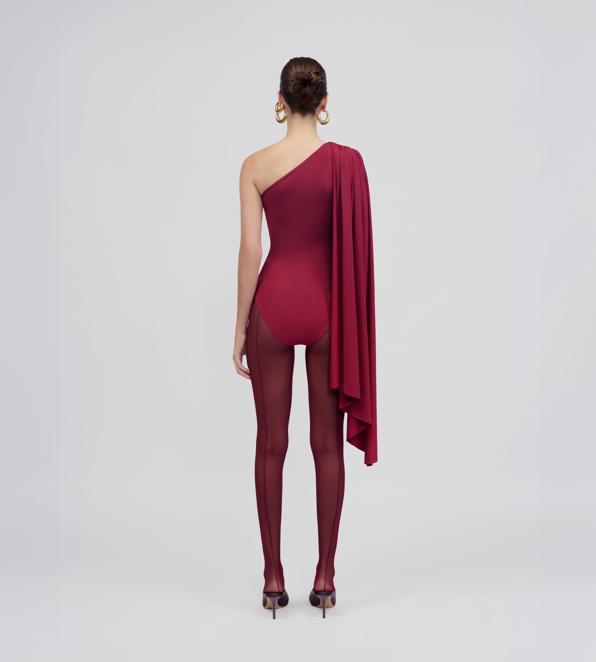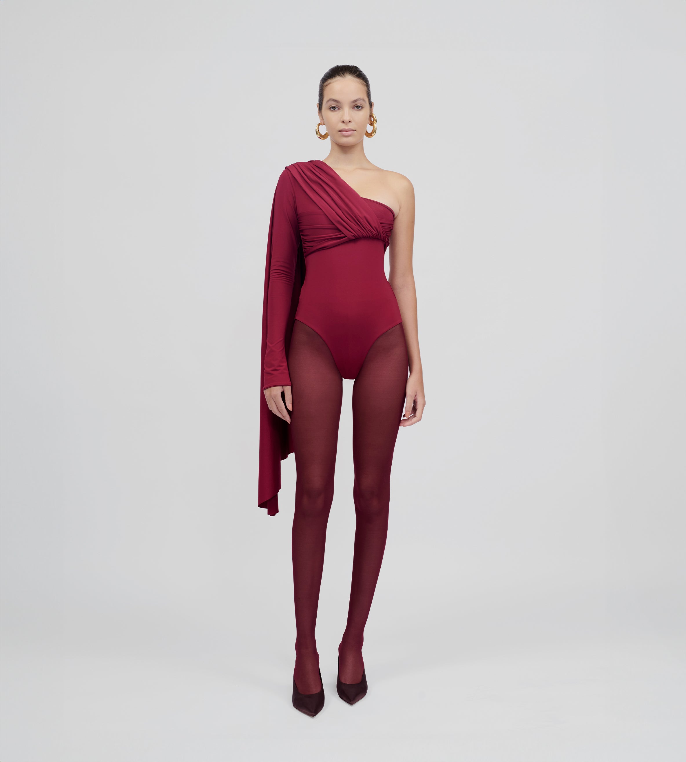 Our Vionnet one-piece radiates sophistication and elegance with its asymmetric layered neckline, featuring a one-shoulder drape finished in a flowy sash and a ruched bodice detail that combines sensuality and grace seamlessly, complemented by a sleek long sleeve. This design is a year long show-stopper. Opt for burgundy, brown or off-white in our insignia knit fabric or for an alluring look go for our new knitted velvet fabric in nightfall.