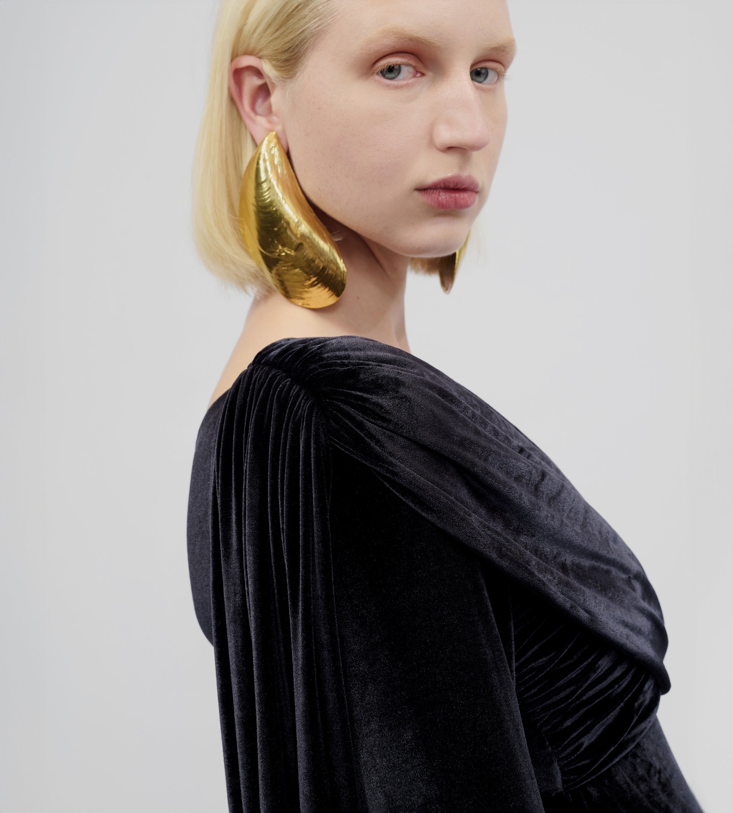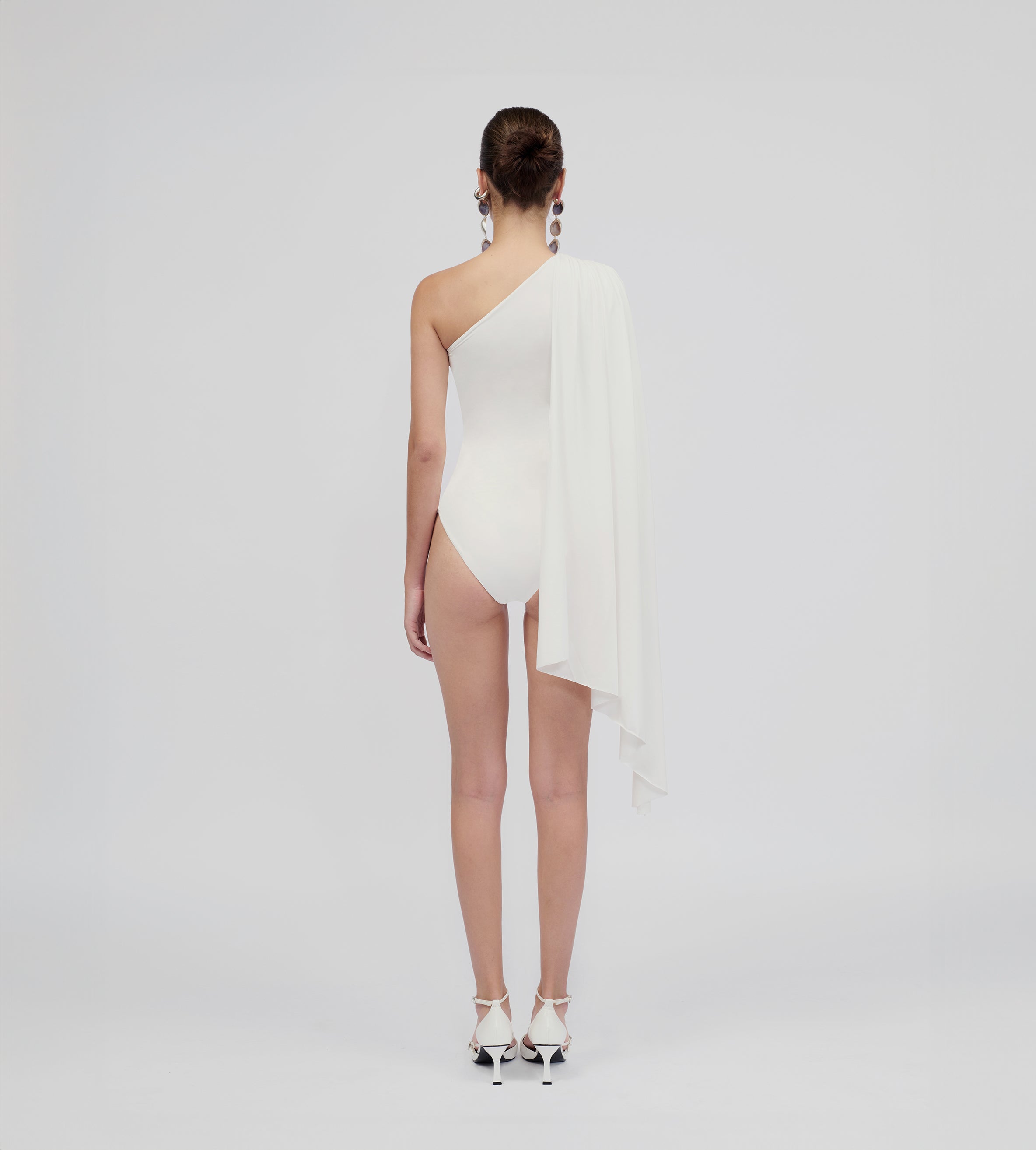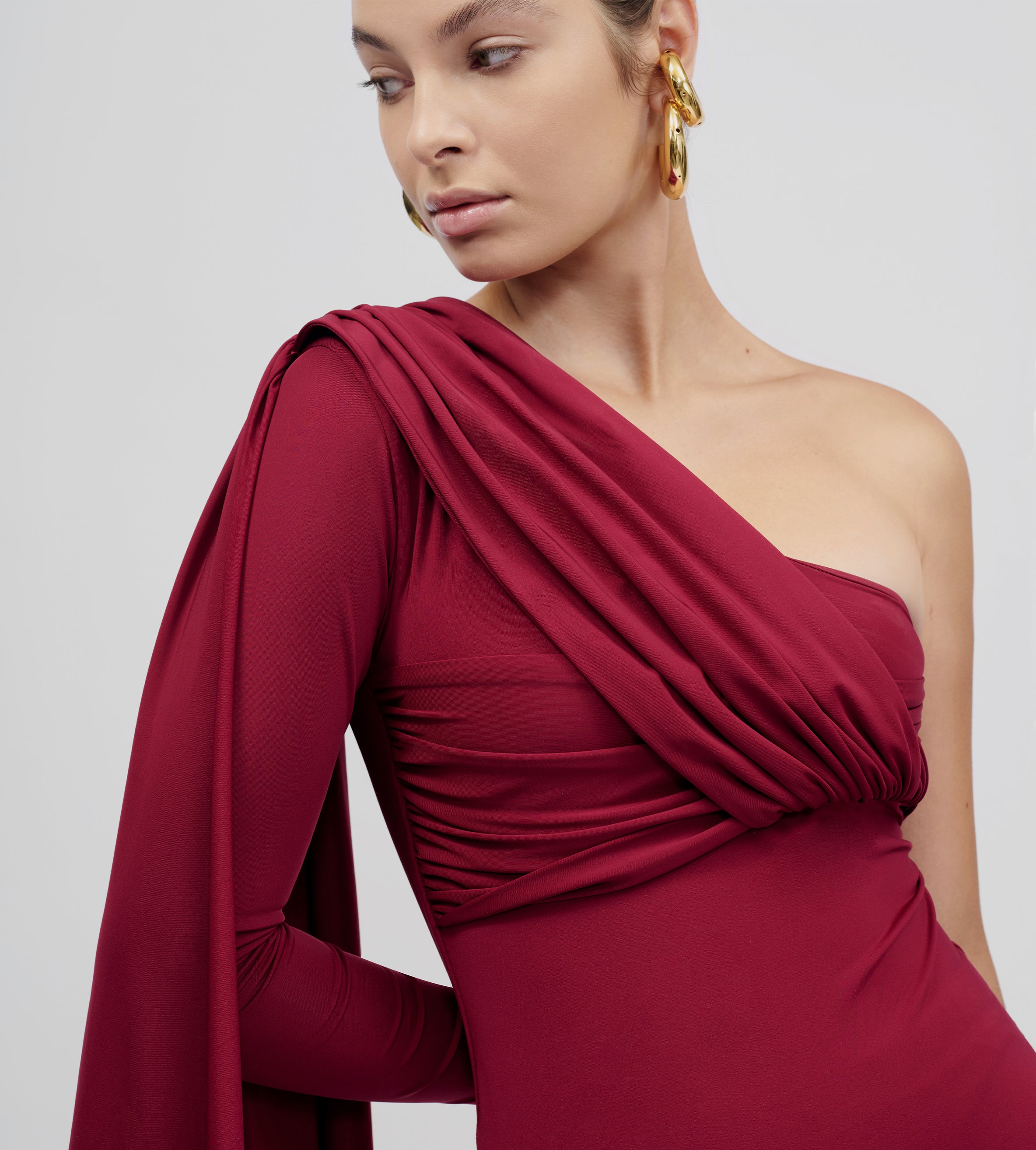 Our Vionnet one-piece radiates sophistication and elegance with its asymmetric layered neckline, featuring a one-shoulder drape finished in a flowy sash and a ruched bodice detail that combines sensuality and grace seamlessly, complemented by a sleek long sleeve. This design is a year long show-stopper. Opt for burgundy, brown or off-white in our insignia knit fabric or for an alluring look go for our new knitted velvet fabric in nightfall.
