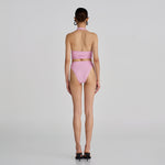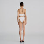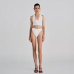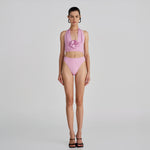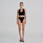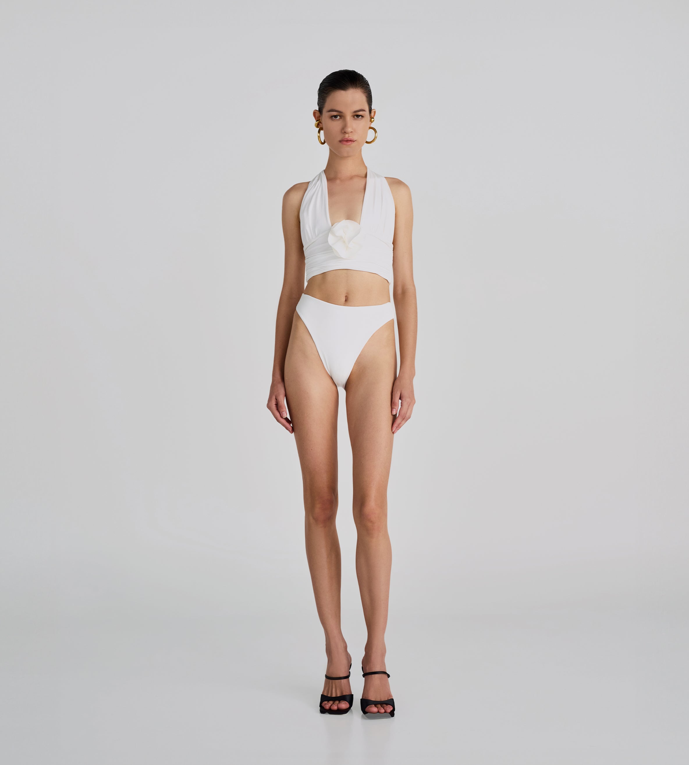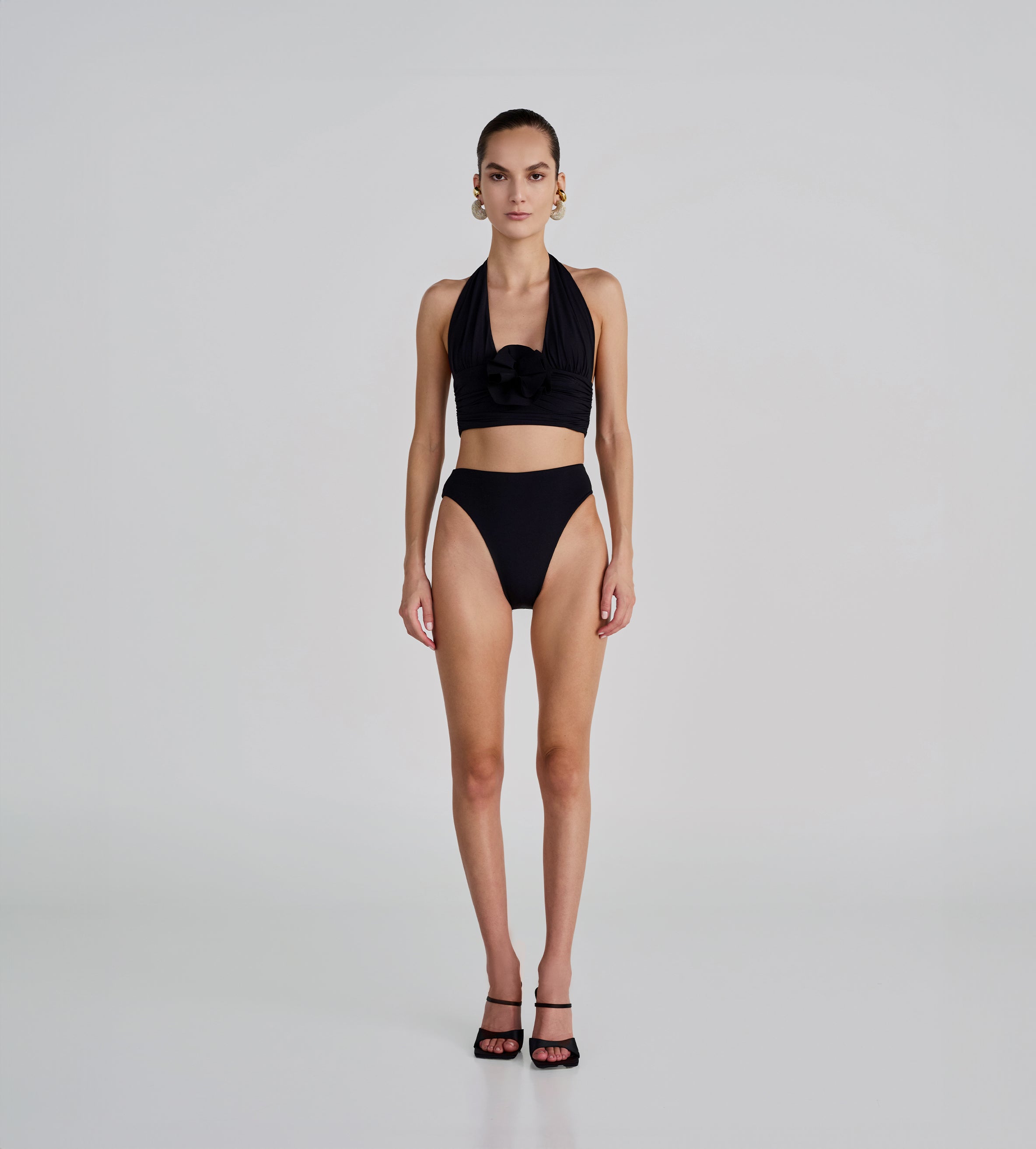 Our Vives two-piece presents and deep halter neckline top with a wide ruched strap that hugs the body perfectly, adorned with a 3D handmade flower detail at front; paired with high-rise, mid-coverage briefs a feminine and flirty combination for the summer days.